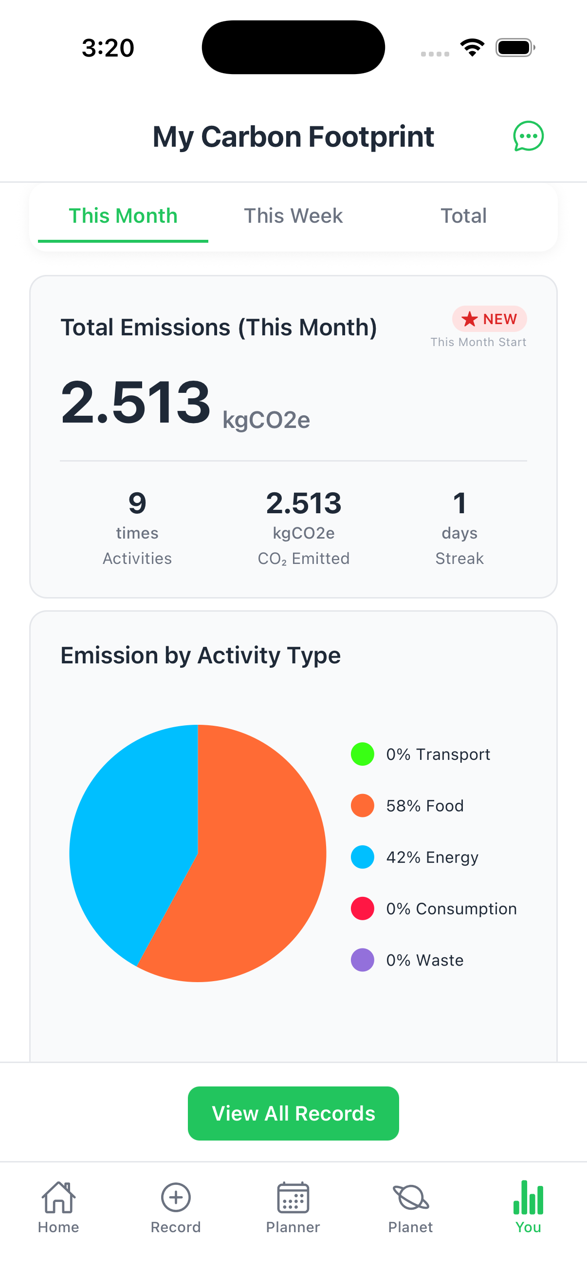 Monthly emissions, beautiful charts, weekly trends. Set goals and track your progress day by day.